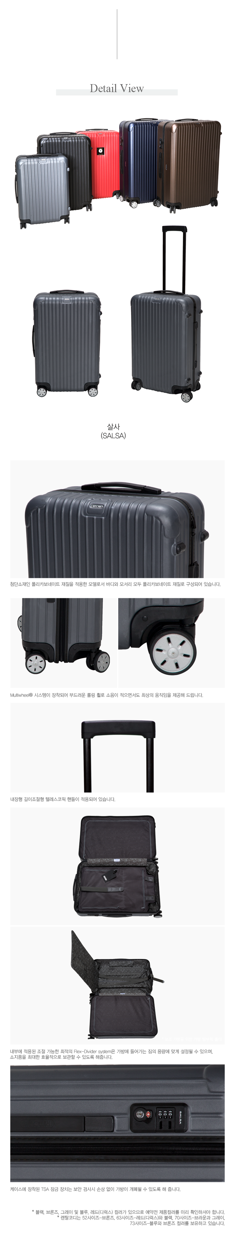 - 첨단소재인 폴리카보네이트 재질을 적용하여 출시한 리모와 살사(Salsa) 제품입니다 바디와 모서리 마감 모두 폴리카보네이트 재질로 구성되어 있습니다.